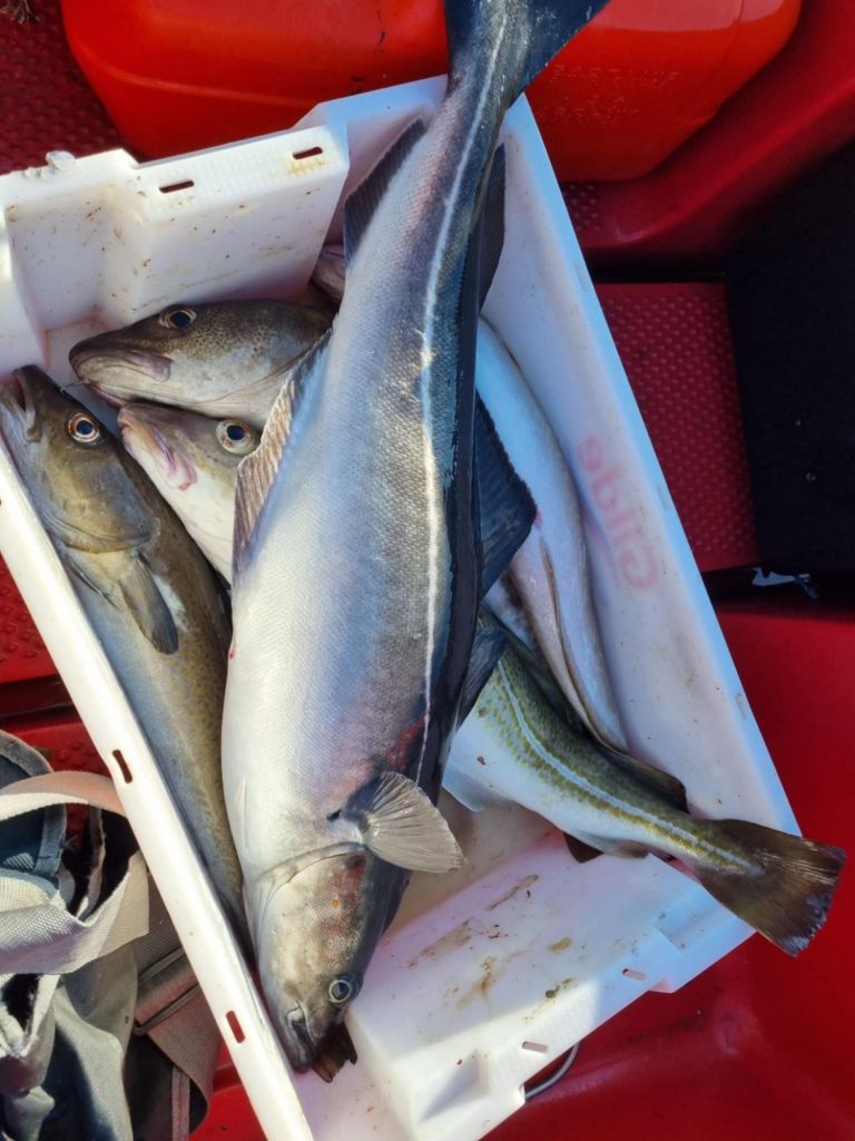 Vi tog en till tur på sjön för att fiska. Vi fick 5 stora fiskar, torsk, sej å långa. Roffes sej vägde runt 5 kg. Superfin. Vi såg även en lunnefågel.