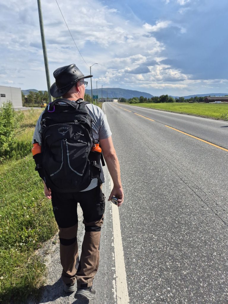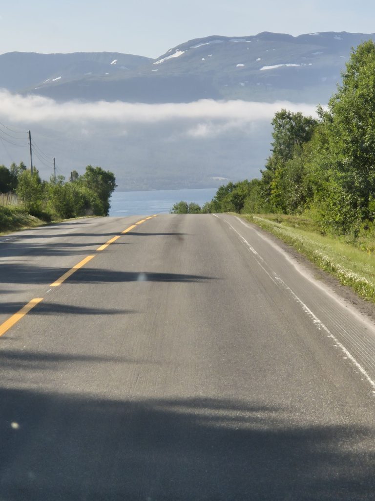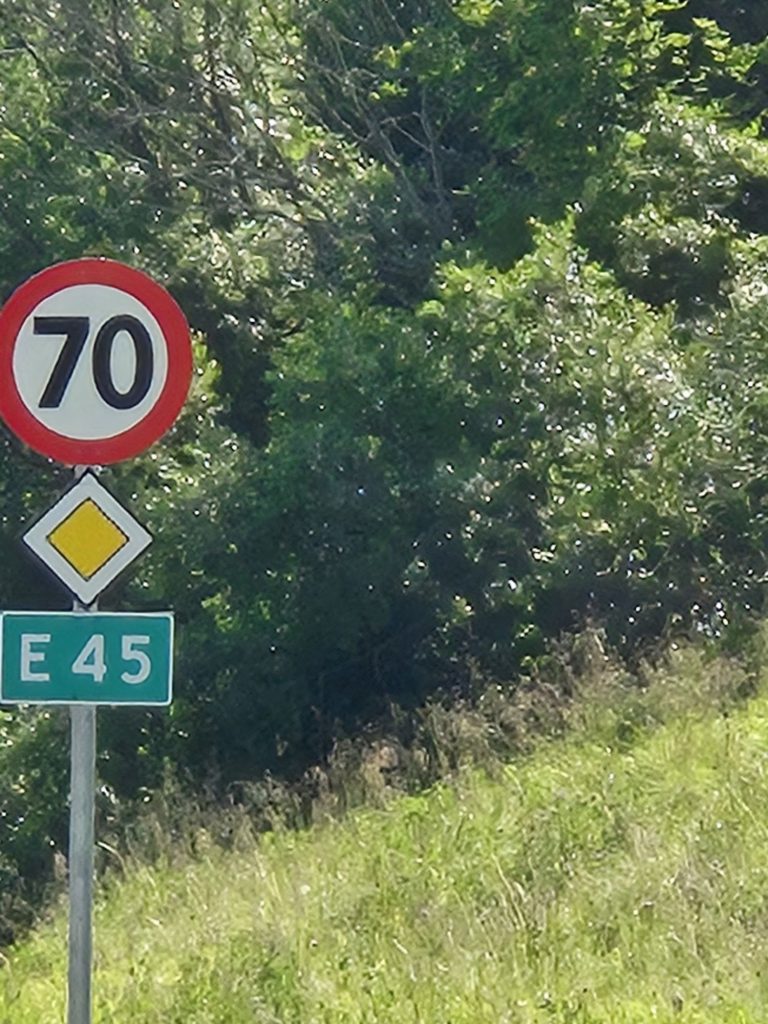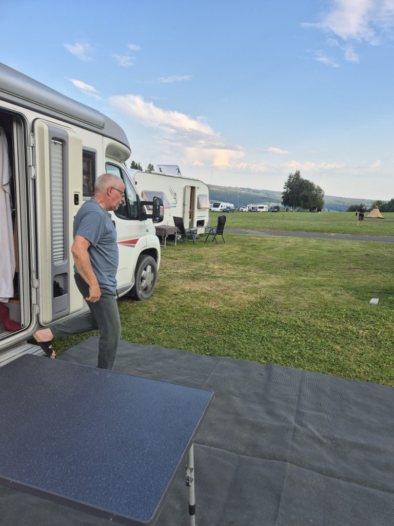 Gick en annan väg tillbaka till campingen. Vi gick på E45. Det fanns ingen annan väg att gå. Helt slut när vi kom tillbaka. Jag gick och vilade. Vi hade 36 grader i husbilen, tur att vi har AC.